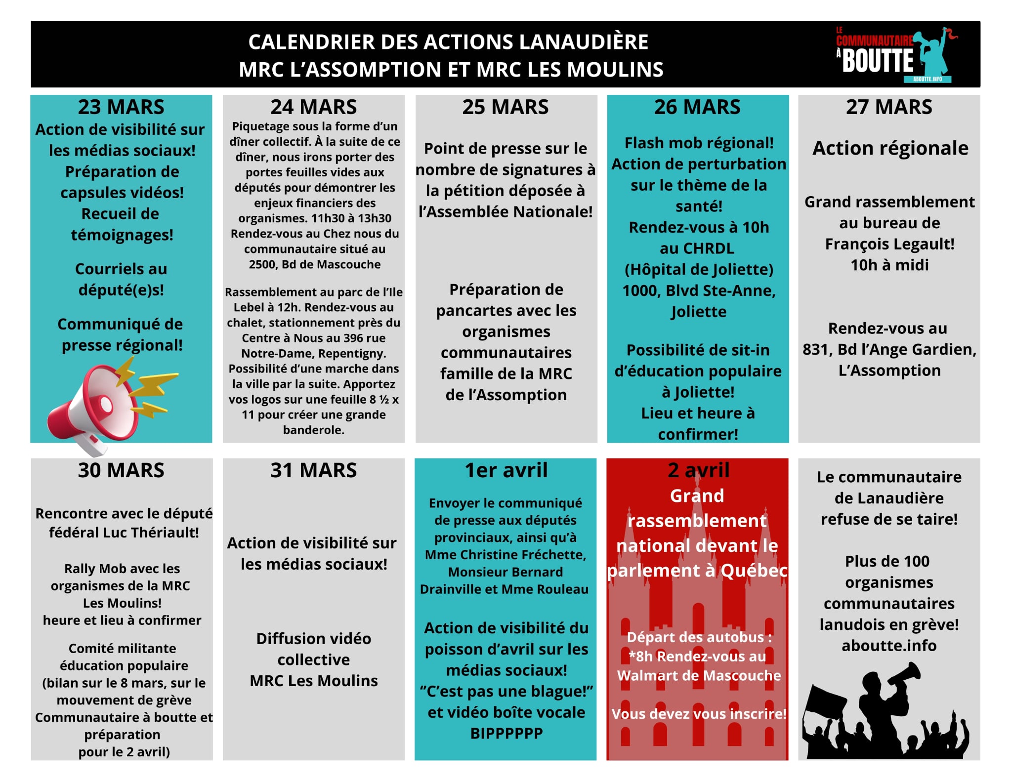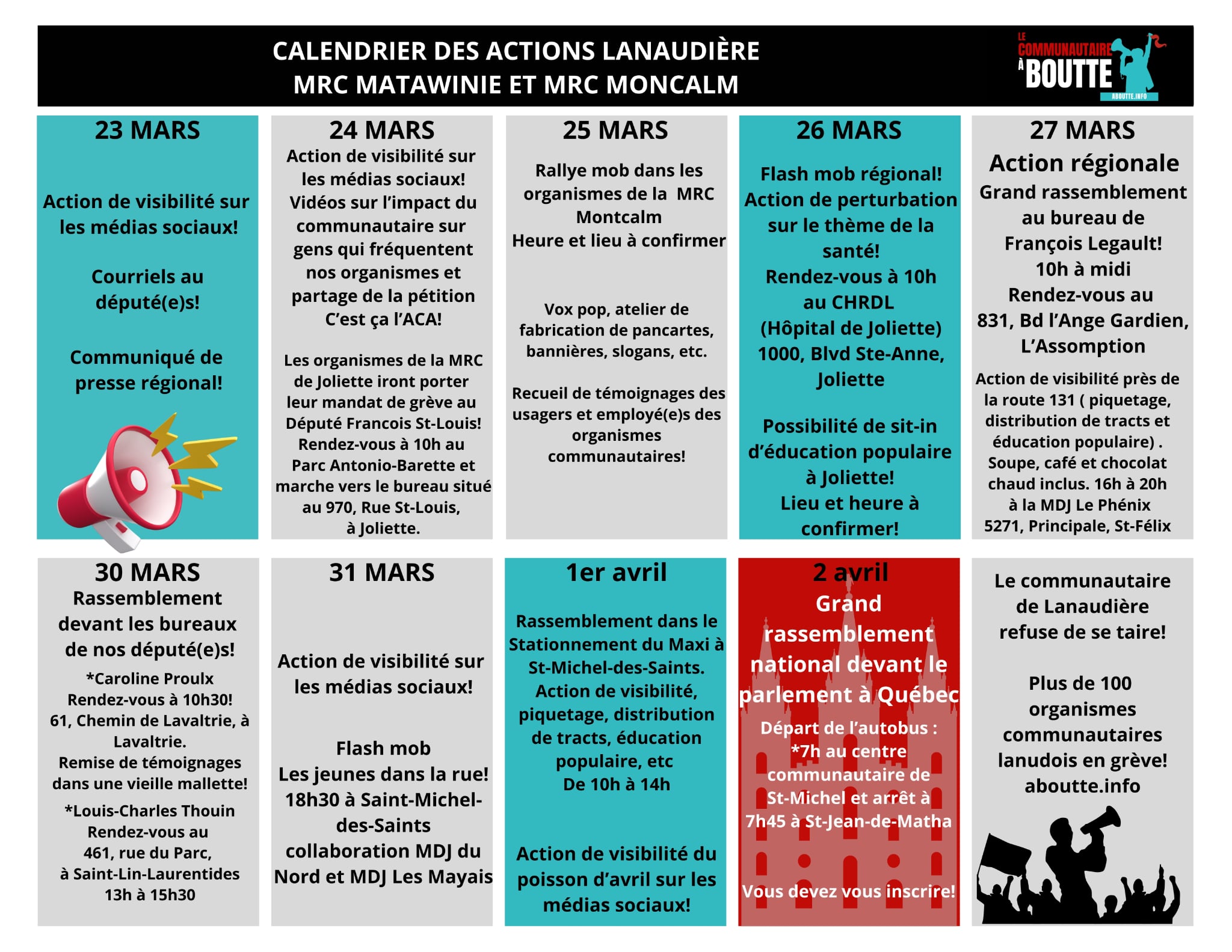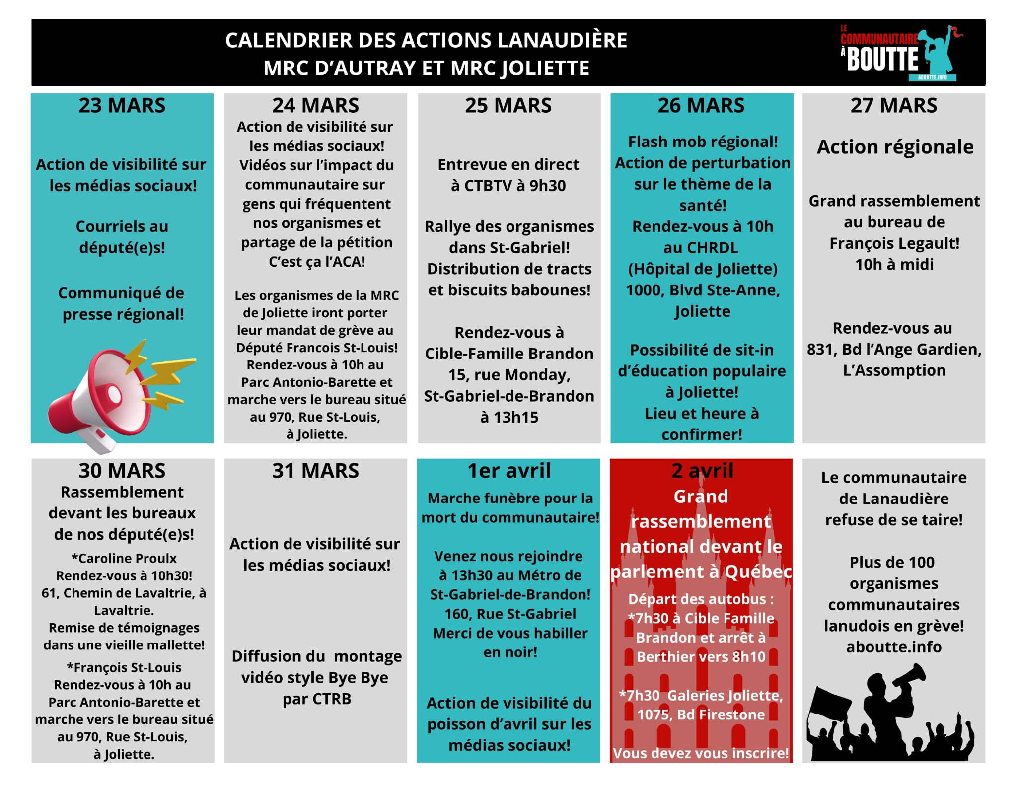 Télécharge le document des ressources et des actions de mobilisation lanaudoises en vue des deux semaines de grève et d’interruption de services.