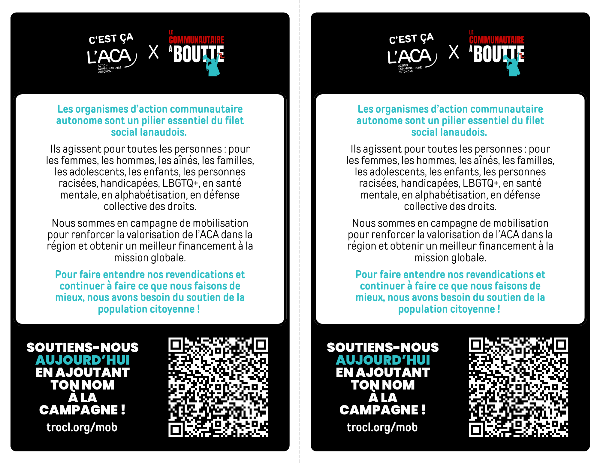 Ces actions sont en cohérence avec la mobilisation régionale C’est ça l’ACA et portent un message clair : l’action communautaire autonome est essentielle et doit être reconnue, respectée dans son autonomie et financée à la hauteur de son rôle.